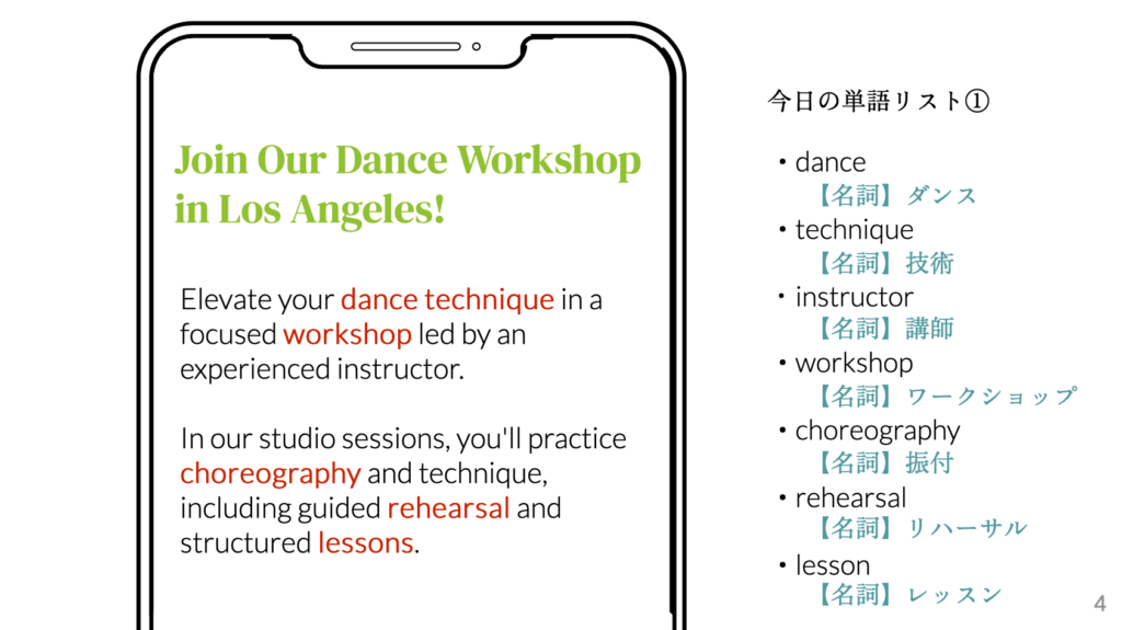 - 「ワークショップの参加者募集のお知らせ」「実際のレッスンでの会話」などの例文を使用して、まず覚えておきたいダンスに関する英単語を学びます。ここを押さえることで、後の講座がぐんと理解しやすくなります。