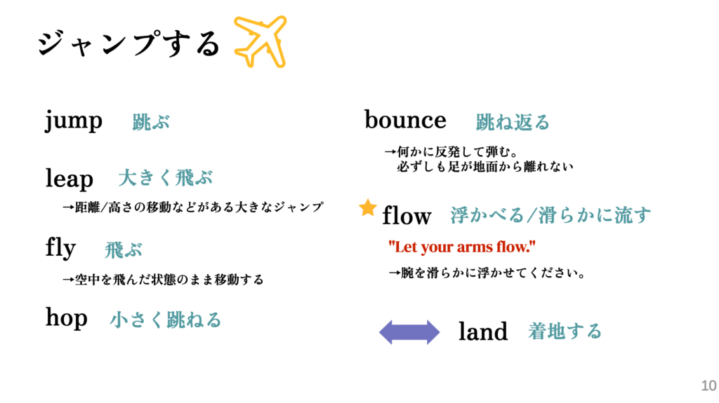 - 「飛ぶ」「回る」など、動きの指示に関する英語を学びます。先生や振付家の指示に正確に反応できるように、似たような意味の単語が持つニュアンスの違いを分かりやすく解説します。