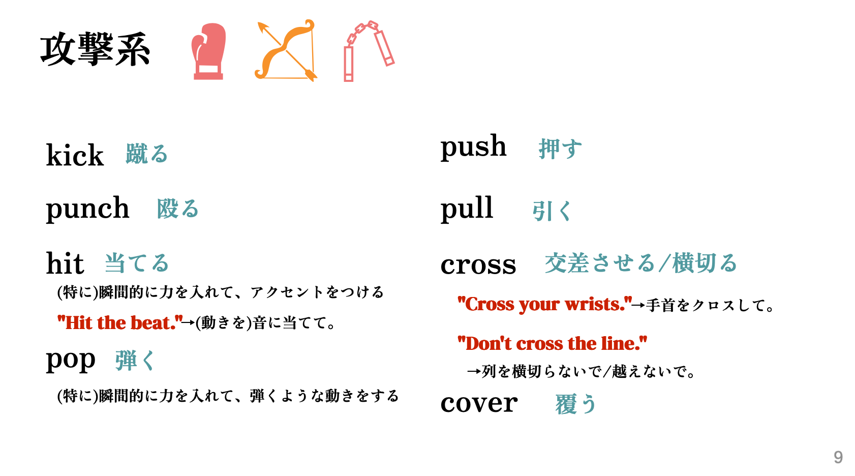 - 「飛ぶ」「回る」など、動きの指示に関する英語を学びます。先生や振付家の指示に正確に反応できるように、似たような意味の単語が持つニュアンスの違いを分かりやすく解説します。