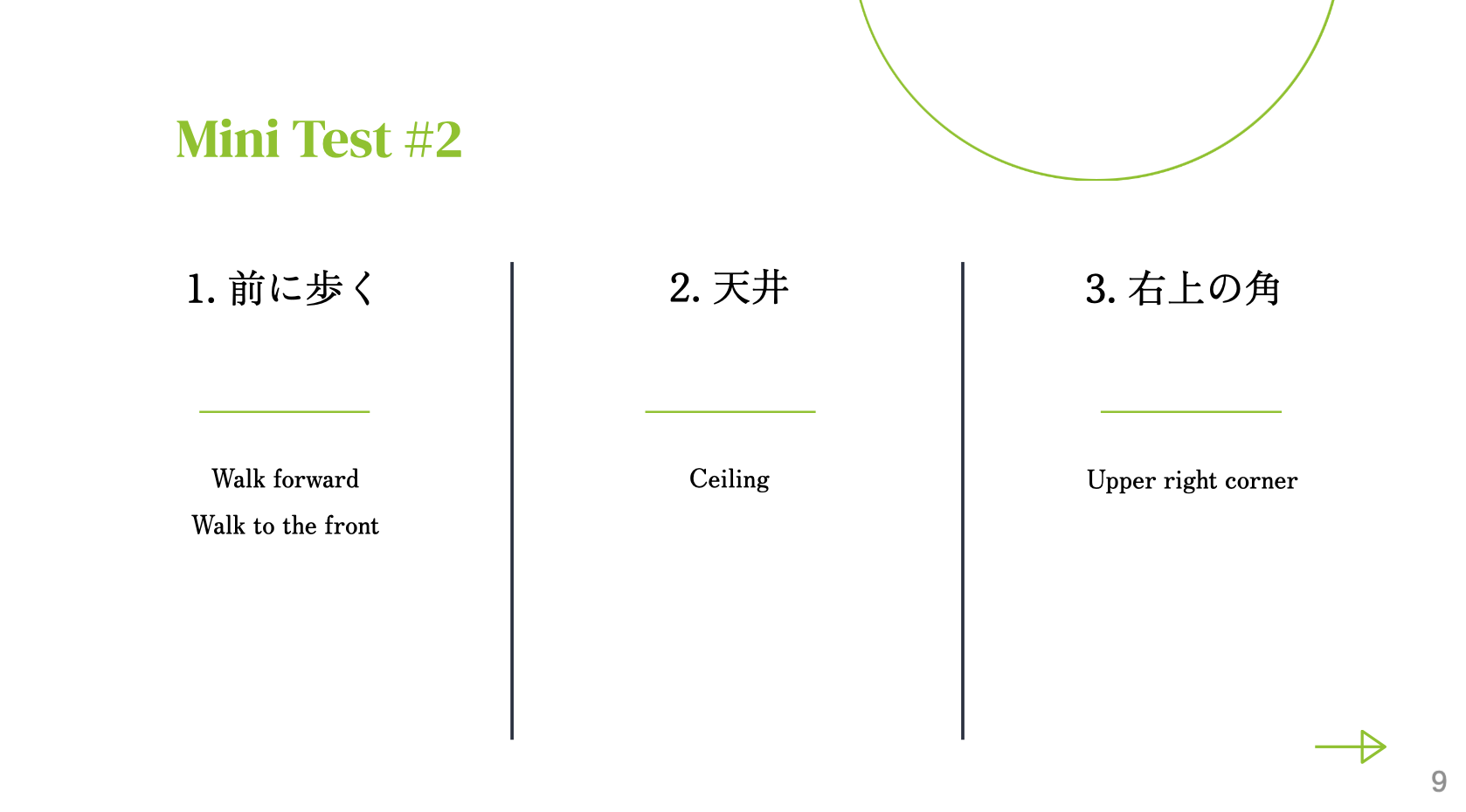 - 体の部位の名前を英語で覚えます。レッスンでの指示で使われる言葉はもちろん、万が一怪我をしてしまった場合に状況を説明できるような語彙を身につけます。